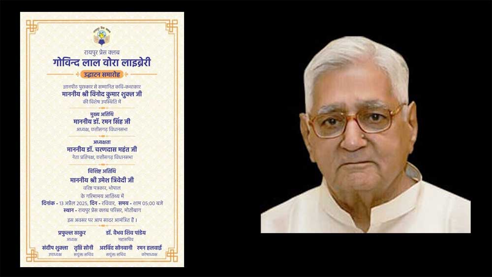 देश के वरिष्ठ पत्रकार और सम्पादक गोविन्दलाल वोरा की स्मृति में आज शाम 5 बजे प्रेस क्लब परिसर में गोविन्दलाल वोरा लाइब्रेरी का शुभारंभ किया जाएगा. ज्ञानपीठ पुरस्कार से सम्मानित कवि-कथाकार विनोद कुमार शुक्ल की विशेष उपस्थिति में आयोजित समारोह में विधानसभा अध्यक्ष डॉ. रमन सिंह मुख्य अतिथि होंगे. अध्यक्षता नेता प्रतिपक्ष डॉ. चरणदास महंत करेंगे. जबकि भोपाल, मध्यप्रदेश के वरिष्ठ पत्रकार उमेश त्रिवेदी विशिष्ठ अतिथि के तौर पर उपस्थित रहेंगे.