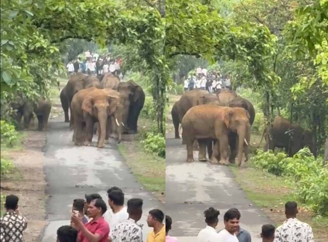 जिले के एडु-सिंघनपुर मार्ग पर शनिवार को जंगल से निकलकर आधा दर्जन हाथियों का दल अचानक सड़क पर पहुंच गया. हाथियों को देखकर ग्रामीणों में अफरा-तफरी मच गई. हाथियों ने सड़क के बीच खड़े होकर रास्ता जाम कर दिया, जिससे दोनों ओर वाहनों की आवाजाही ठप हो गई.