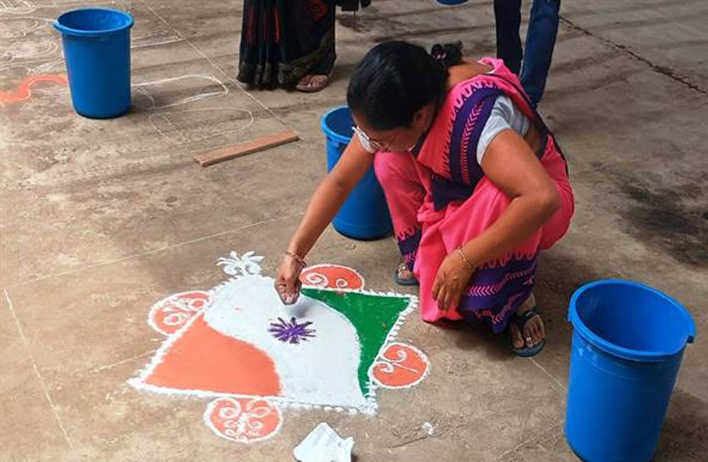 बहनों ने रंगोली बनाकर दिया हर घर तिरंगा अभियान का संदेश