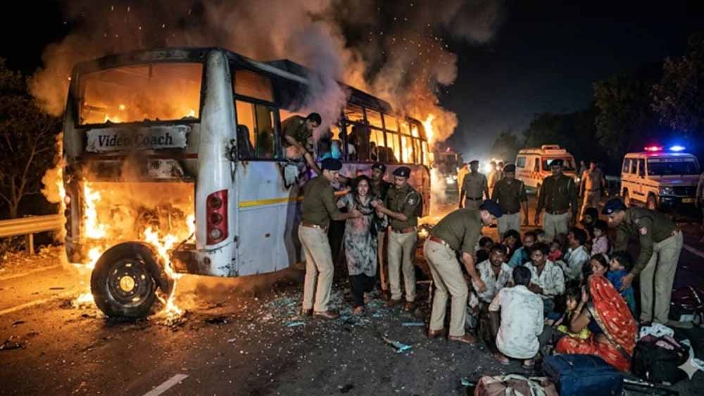 जयपुर से चलकर छतरपुर के बागेश्वर धाम जा रही एक वीडियो कोच बस टायर फटने के बाद आग की चपेट में आ गई। इस दौरान बस में सवार 16 यात्री नींद की आगोश में थे, लेकिन पुलिस की तत्परता और सूझबूझ से सभी की जान बच गई।