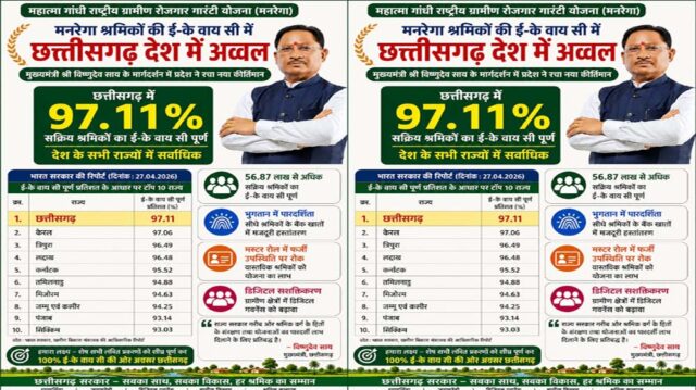 महात्मा गांधी राष्ट्रीय ग्रामीण रोजगार गारंटी योजना (मनरेगा) के अंतर्गत श्रमिकों के ई-के वाय सी कार्य में छत्तीसगढ़ ने पूरे देश में प्रथम स्थान प्राप्त कर उल्लेखनीय उपलब्धि हासिल की है। भारत सरकार द्वारा जारी ताजा रिपोर्ट के अनुसार प्रदेश में 97.11 प्रतिशत सक्रिय श्रमिकों का ई-के वाय सी पूर्ण कर लिया गया है, जो राष्ट्रीय स्तर पर सर्वाधिक है। खास बात यह है कि छत्तीसगढ़ ने केरलम, त्रिपुरा, मिजोरम जैसे छोटे राज्यों तथा कर्नाटक, तमिलनाडु जैसे बड़े राज्यों को भी पछाड़कर यह उपलब्धि हासिल की है।